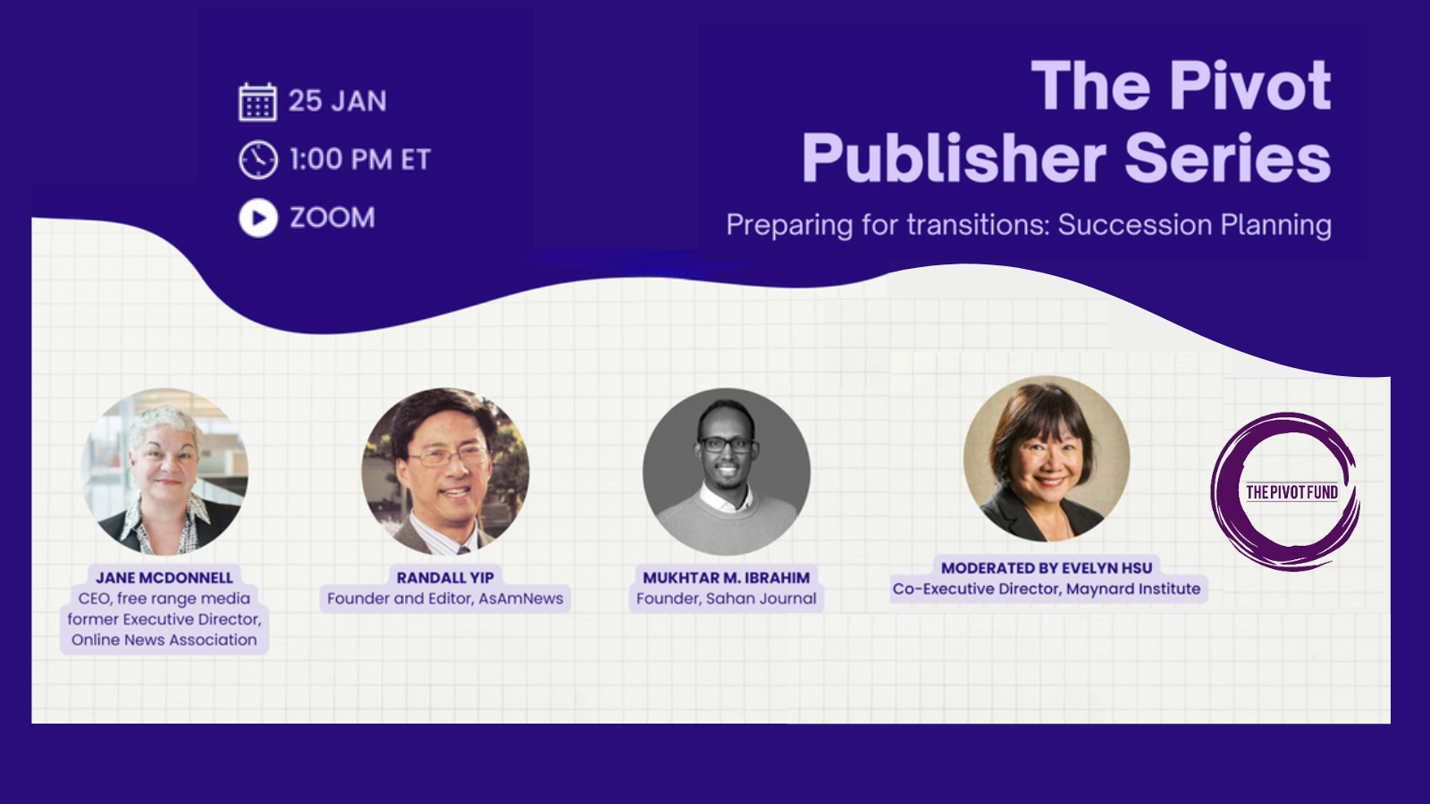 Maynard Institute Co-Executive Director Evelyn Hsu will moderate an online discussion titled, Preparing for transitions: Succession Planning on Thursday, January 25, 2024. Kicking off The Pivot Fund’s new Publisher Series, this zoom webinar is a resource for BIPOC publishers and founders seeking to navigate the intricacies of succession planning and secure the long-term success of their newsrooms.