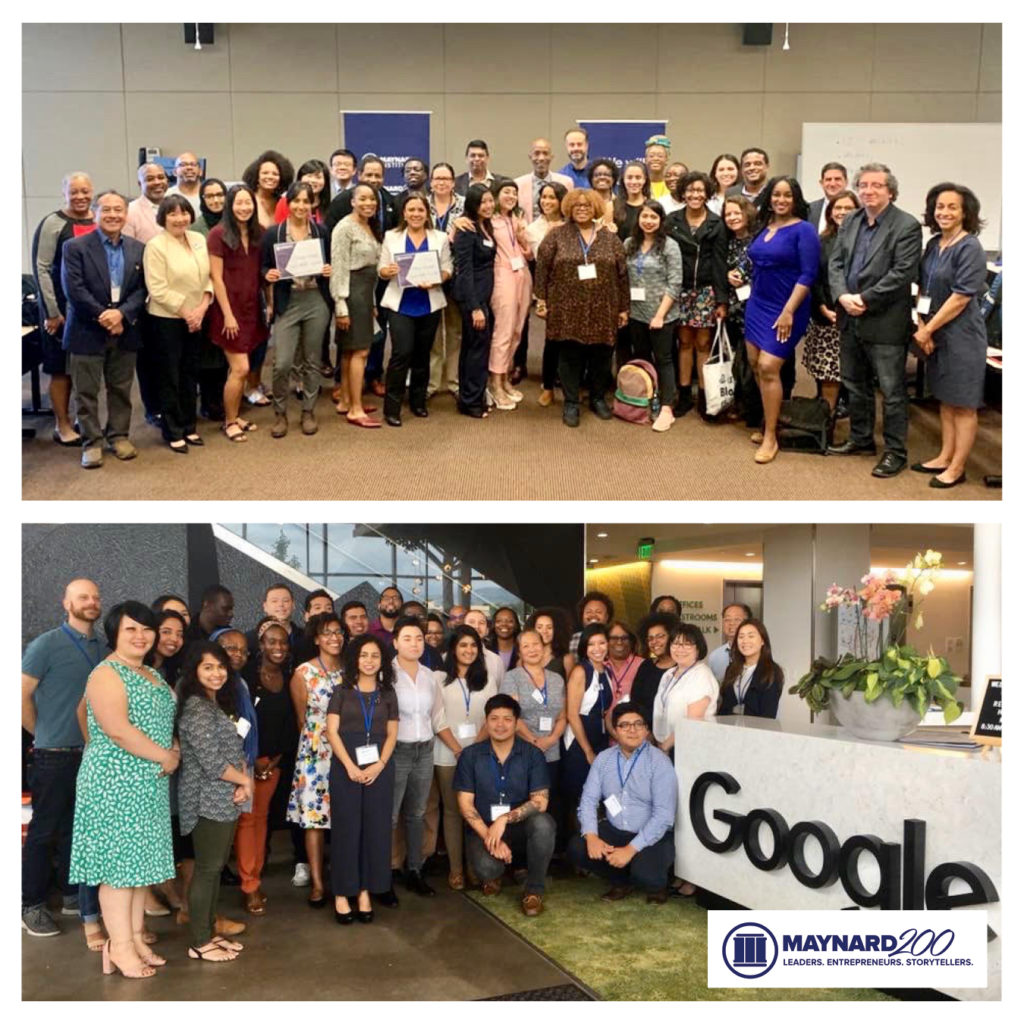 The Maynard 200 journalism fellowship program cohorts with some of their mentors, faculty, track executives-in-residence and MIJE executive team. Top: The 2019 class at USC Annenberg School for Communication and Journalism in Los Angeles, CA; Bottom: The 2018 class at the Google campus in Boulder, CO